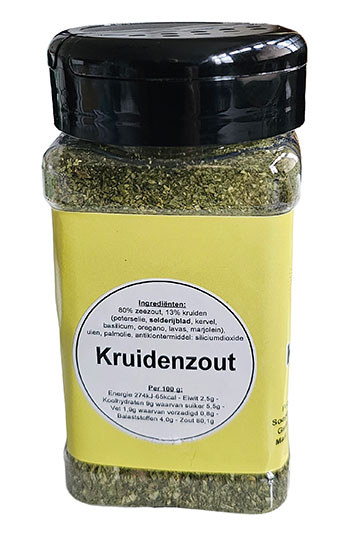 Zeer smakelijke kruiden voor dagelijks gebruik. Zeezout, peterselie, selderijblad, kervel, basilicum, oregano, lavas, marjolein, uien.